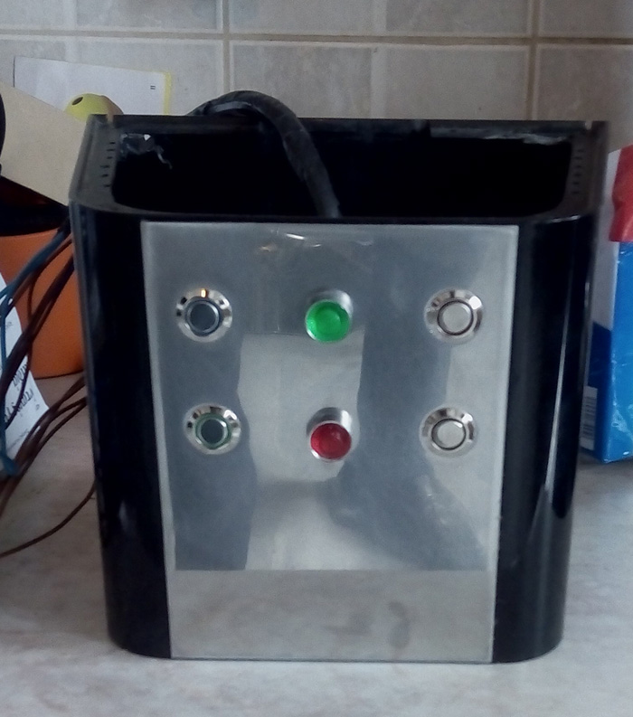 εδω βλεπουμε την ετοιμη πλεον προσοψη. αριστερα πανω ειναι το μπουτον της εκχυλισης.αριστερα κατω ειναι το μπουτον του νερου.δεξια πανω ειναι το μπουτον μεταβασης σε λειτουργεια ατμου.δεξια κατω ειναι το μπουτον της ηλεκτροβανας.το πρασινο φως δειχνει την ενεργοποιηση της μηχανης,και το κοκκινο δειχνει ποτε δουλευει η αντισταση.