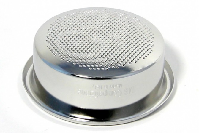 The shape was created by I.M.S. to obtain the proper ratio between the base and height of the coffee puck in relation to capacity. The filter is cylindrical with a convex bottom to collect the coffee towards the center during percolation. This shape has been designed to exploit the whole coffee puck, which also facilitates drying and expulsion.
